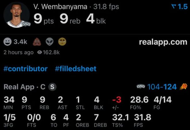 最终,文班亚马14投4中,拿到9分9篮板2助攻4封盖,出现了6次失误,表现很是低迷,马刺队也是以118比130输给了太阳队,不败金身被破,终结了5连胜。