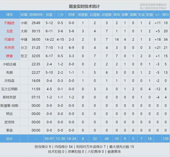 掘金此役三人得分20+:约基奇34分7板14助4断2帽、布劳恩21分4板3助、戈登20分7板。先来看看本场数据: