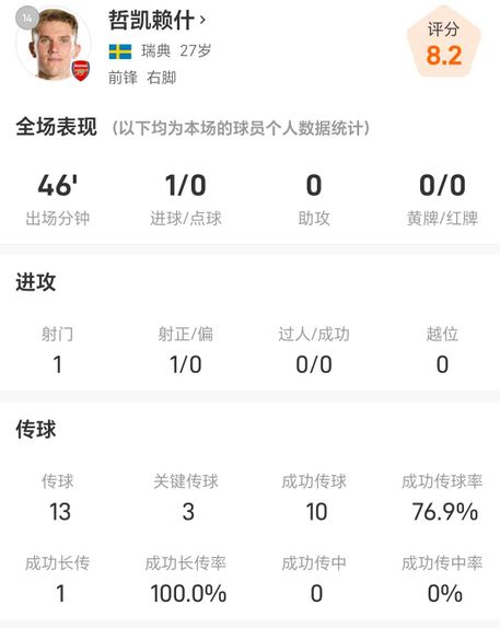 雷速体育11月2日讯 英超第10轮,阿森纳迎战伯恩利, 本场比赛,哲凯赖什首发出场,他全场比赛数据如下: